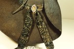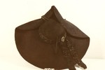 Halbrunder gesteifter Kopf mit breiter Krempe, vorne zur Spitze gebogen, mit Bändern in Form gehalten, rückseitig gerade, vorne links vierfache Bandgarnitur mit leinenumsponnenem Zierknopf. Hutband mit langen Enden aus Reliefsamt mit stilisiertem Granatapfelmotiv und verzierter Schnalle.
