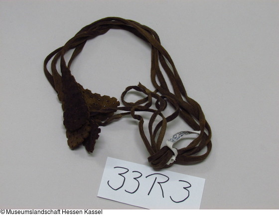 2 Paar braune Bänder, aus einem Stück geschnitten, unten in eine längliche Dreiecksform mit bogenförmig ausgeschnittenen Rändern auslaufend; Perforierung in regelmäßigem Lochmuster.