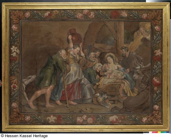 Das bislang in der Forschung unbeachtet gebliebene Werk gehört zu einer Gruppe von sogenannten Streubildern oder Flockbildern, die 1747 im Inventar des landgräflichen Kunsthauses erwähnt werden. Neben „Zwei fruchtstücken“ wird dort auch „ein groß stück, die geburt Christi vorstellend“ erwähnt, das wohl mit dem ausgestellten Stück identisch sein dürfte. Am 24. März 1708 hatte Landgraf Carl für „Zwey von Sträuarbeit gemachte Mahlereyen“ von Christoph Zipper 30 Thaler bezahlt, sodass zu vermuten ist, dass auch das Stück mit der Anbetung der Hirten von diesem Künstler stammt. Zippers Streuarbeit ahmt auf täuschende Weise Tapisserien nach und belegt einerseits das Interesse an künstlerischen Imitationen oder optischen Spielereien im Kunsthaus unter Landgraf Carl, andererseits die Förderung innovativer künstlerischer Techniken.