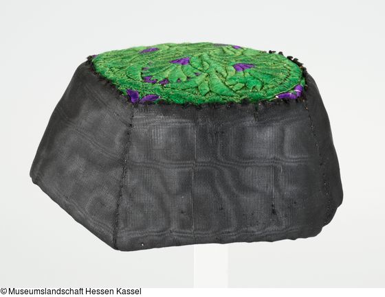 Verzierung: schwarze Bandeinfassung; Boden ausgefüllt mit unterlegter, spiegelbildlich angeordneter Plattstichstickerei (Nelken-, Tulpen- und Herzornamente); spiegelbildliche Kantillen.