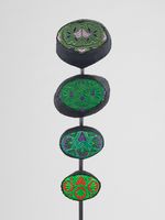 Stickerei: grüne, lila und blaue Platt-, Stiel-, Schling- und Vorstiche über Pappeinlage.