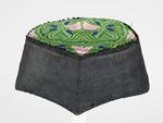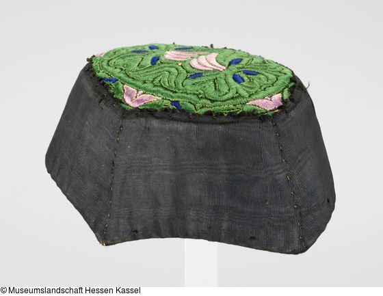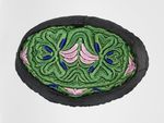 Verzierung: schwarze Bandeinfassung; Boden ausgefüllt mit unterlegter, spiegelbildlich angeordneter Plattstichstickerei (Nelken-, Tulpen- und Herzornamente);
