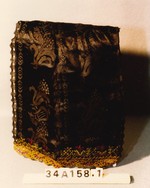 Verzierung: Rand mit schwarzer Bandeinfassung. Boden ganz ausgefüllt mit unterlegter Plattstichstickerei (Herz-, und florale Motive, spiegelbildlich angeordnet)