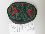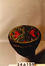 Verzierung: Rand mit schwarzer Bandeinfassung. Boden ganz ausgefüllt mit unterlegter Plattstichstickerei (Herz-, und florale Motive, spiegelbildlich angeordnet). An Kinnbändern Kreuzstichmonogramm "A M O", gehöhte Plattstichstickerei und Nadelspitze in grün und rot.
