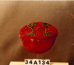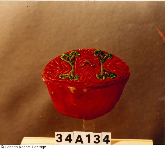 Verzierung: rote Seidenbandeinfassung, Boden ausgefüllt mit spiegelbildlicher Stickerei (Tulpen-, Nelken-, Herzmotive) in unterlegtem Plattstich. Kantillen.