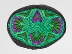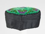 Verzierung: schwarze Bandeinfassung, Boden ausgefüllt mit spiegelbildlicher Stickerei (Nelken-, Herzmotive) in unterlegtem Plattstich.
