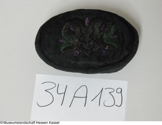Verzierung: schwarze Bandeinfassung, Boden ausgefüllt mit spiegelbildlicher Stickerei (Tulpen- und Herzmotive) in unterlegtem Plattstich.