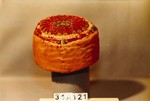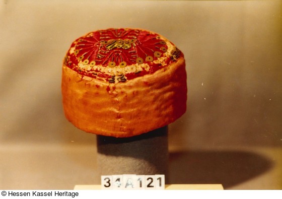 Verzierung: rote Bandeinfassung; Boden ausgefüllt mit unterlegter, spiegelbildlich angeordneter Plattstichstickerei (Nelken-, Tulpen- und Herzornamente); spiegelbildliche Kantillen.