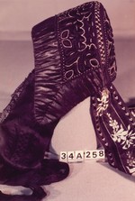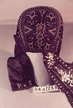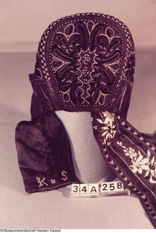 Verzierung: dem Schnitt folgend in floral/ornamentalem Muster Seidenstickerei; Nahtbetonung; Kinnbänder zum Gesicht hin mit Spitze verziert, unten Monogramm in Kreuzstich "K S".