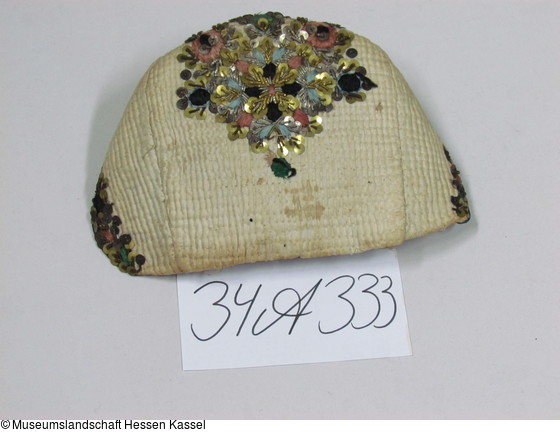 Verzierung: auf dem Boden stilisiertes Blütenmotiv in silber-/goldfarbenen Pailletten und Kantillen und bunter Seide; am Gesichtsteil schmales, über den Ohren etwas breiter, dito Seidenrand mit Ripskordelabschluß über den Ohren in Schlaufen gelegt; Haube gleichmäßig handgesteppt.
