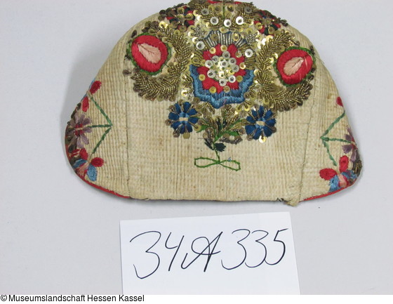 Verzierung: auf oberem Teil des Bodens stilisiertes Blütenmotiv aus Pailletten, Kantillen und bunter Seide; am Gesichtsteil schmaler, in der Mitte und über den Ohren etwas breiterer dito Seidenstickereirand mit Ripskordelabschluß, über den Ohren in Schlaufen gelegt; Haube gleichmäßig gesteppt