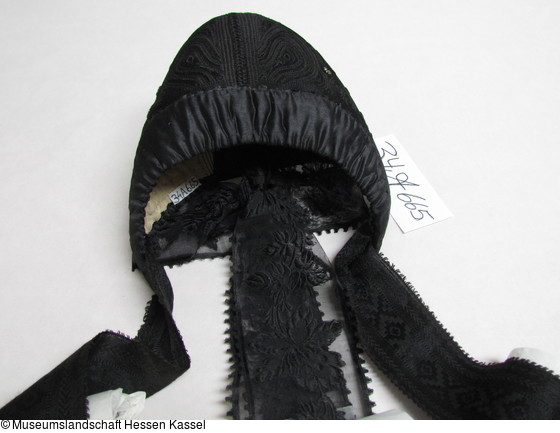 Kinnbänder: schwarzer Seide, zusammengesetzte Bindung in ornamentaler Musterung mit Pikots, mit Schlingstich gesäumt