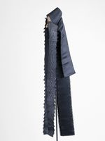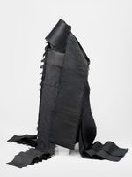 Umlegeband: schwarzer Seidenatlas, ornamental gemusterte Randstreifen, Ton in Ton; gerade und gebogte Pikotrandung; Abschluß in gebogter blauer Perlstickerei
