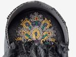 Verzierung: Boden unten mit Bändchen gezogen; auf oberem Teil des Bodens halbkreisförmig Gold- und Silberperlenstickerei mit wenig Glasperlen, stilisierte Blütenformen, rosettenartig angeordnet; Haube breit gefaßt, durch Abnäher geformt