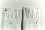 Rundgestrickt, glatt rechts; oben je 3 eingestrickte Vasenmotive mit Monogramm "M..."(?), "FI.." (?), "FN." (?), darüber Bund mit einer Abart des Fischgrätenmusters (senkrechtes Gräten/Lochmuster) und gebogtem Abschluß; kleine Flechtbänder.
