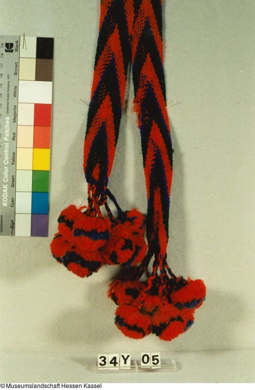 Von der Mitte ausgehend aus Wollfäden geflochtene Bänder in schräg kreuzendem Muster ("Scheren"), unten in je 9 kleinen Zöpfchen mit kleinen Wollquasten ("Kirschen") endend.