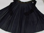 Farbe: Schürze: dunkelblau; Bund: schwarz, Stickerei: grün, lila, rosa, rot, gold und silber; Borte: schwarz, grün, lila; Band: grün.