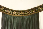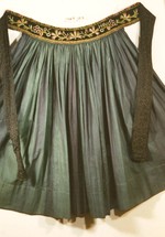 Aus zwei Stoffbahnen an den Webkanten mit überwendlichen Stichen zusammengefügt in grün mit dito Saum; Bund in Sprengtechnik mit stilisierten Blüten und Nelken bestickt und mit Borten und Band besetzt; schwarze gemusterte Bindebänder. In gehöhter Silber- und Goldstickerei auf dem Bund: "C A R H".