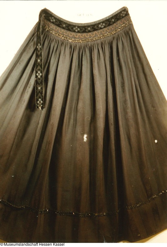 In sich gestreiftes und gemustertes Wolltuch, eine Webkante und eine Nähmaschinenkante; am Bund gefältelt und mit geometrisch gemustertem Seidensamtband (gleichzeitig Verschluß) besetzt; darunter Posamentenborte, im Saumbereich eine Reihe verschiedener Glasperlenborten.