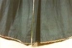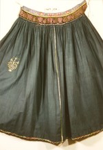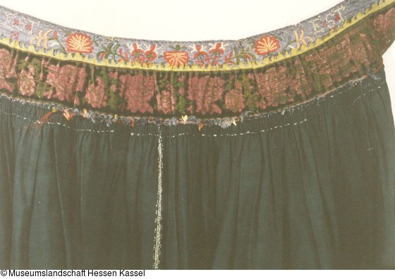 Aus zwei Stoffbahnen an den Webkanten in der Mitte mit verflochtenem Schlingstich zusammengesetzt, Saum nach außen gelegt und mit kleiner Borte bestickt; Bund aus schwarz, lila, grün blütengemustertem Seidensamtband, Posamentenborte und grünem und blauem Seidenripsband mit Pikots; oberes blaues Band bestickt mit Blüten- und Nelkenmotiven und Monogramm in Kreuzstich "EST / EST"; auf der Schürze rechts "E/ST / 1850" in aufgesticktem Herz.