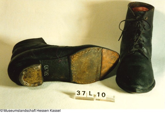 Knöchelhoch, über einen Leisten geschlagen, auf 6 paarige Ösen im Schaftteil und 2 im Vorderblatt zu schnüren; geschwungener, vorgezogener Schichtabsatz mit Metallbeschlag, Holzstiftnagelung, verschiedene Flickleder auf die vorderen Sohlenteile genagelt, im Gelenk genagelt, im "rechten" Schuh im Ösenbereich aufgesteppte Flicken; Schnürsenkel L: 92/93 cm, B: 0,5/0,6 cm.