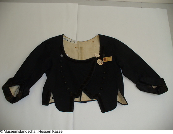 Schwarzes Tuch; Kanten mit schwarzem Samt, und an den Ärmeln mit (z. Teil) schwarzer Seide besetzt; Aufschläge aus schwarzer Seide mit weißen Punkten;