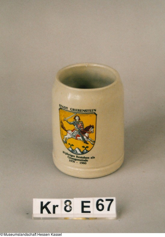 Flacher Boden mit Standrand, zylindrische Wandung zum oberen Rand hin eingezogen, vertikaler Henkel. Beige Farbgebung. Auf Vorderseite aufgedrucktes Wappen der Stadt Grebenstein: Auf gelbem Hintergrund Ritter auf Schimmel im Sprung über drei Hügel mit Schwert und Schild (mit Hessenlöwe) ausgestattet.