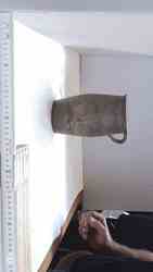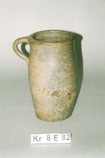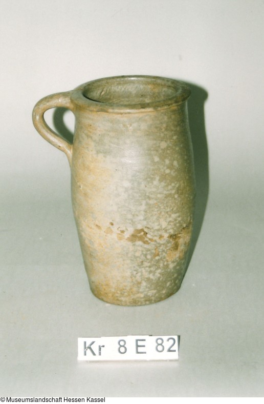 Flacher Standboden mit exzentrischen Abschneidespuren. Leicht gebauchte Wandung. Lippenrand. Randständig angarnierter vertikaler Bandhenkel tangential auf Wandung tangential verstrichen. Salzglasur mit grauer Farbwirkung.
