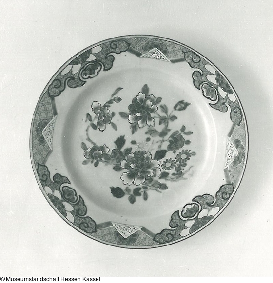 Famille rose. Ältere Inventare: B XIII, Nr. I 31 ("Achtzehn flache Teller, mit Blumen, rosa und blau."); Concept, Nr. 152.