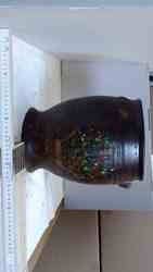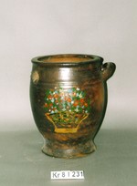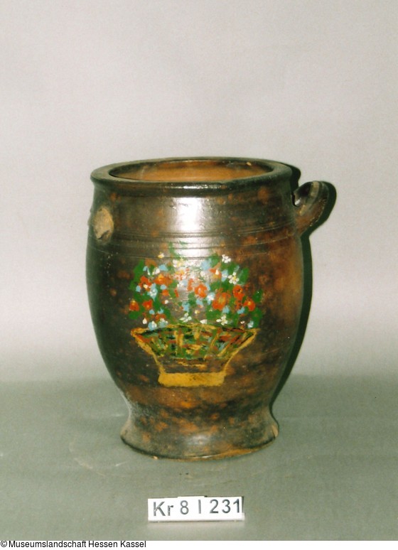 Heller Scherben, außen glasiert. Unregelmäßig gearbeiteter Standring und stark nach außen gewölbter Gefäßboden. Weiß ausschwingende Fußzone. Stark gebauchter Gefäßkörper mit abgeplattetem Wulstrand. Schulterständige, gegenständig horizontal stumpf angarnierte Wulsthenkel. Gefäß außen mit hellbrauner Farbwirkung, fleckig. Bauchg ob en begrenzt durch umlaufende Steg-Kehlung-Bänder, unten durch mehrere Schmuckrillen. Auf Wandung gegenüberliegend Reste von aufgemaltem flroalem Motiv. Bemalung vermutlich nachträglich.