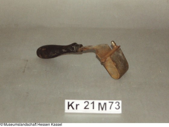 Schmale vorn abgerundete Bolzenkammer mit bewglich angeschraubter Verschlußklappe, gebogenem Hals mit Angel, die in gedrechselten Holzgriff eingelassen ist. Mit verchromter Metallhülse zur Verstärkung.