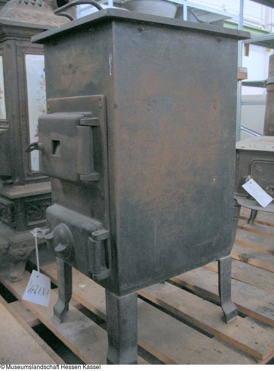 Rechteckiger Ofen auf vier Beinen mit leicht nach außen abgewinkelten Füßen. Feuerungstür und Aschekastentür vorn, letztere mit Regulierscheibe, Rauchabzug hinten. Klappdeckel an zwei rückseitigen Scharnieren befestigt, mit nach vorn geneigtem Rundeisengriff. Unter dem Deckel Hohlraum zur Aufnahme von Bügeleisen.
