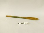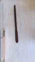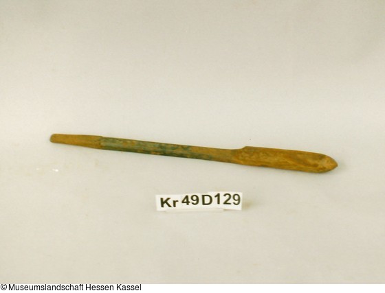 Bohrteil sichelförmig, löffelartig (Schale). Spitz zulaufende Form (Zahn). Schaft läuft zur Angel hin konisch und rund zu, abgebrochen.