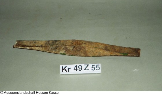 Von der Mitte ausgehend, in beide Längsrichtungen flacher werdendes Schlagwerkzeug mit ovalem Öhr, das an beiden Enden in liegenden Finnen endet.
