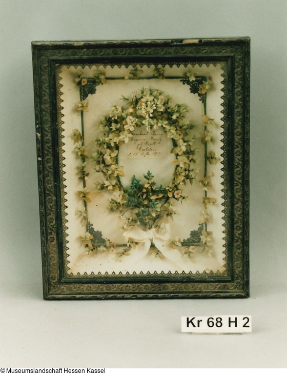 Bild: in Oval montierter Myrthenbrautkranz aus Textilblumen als "Rahmung" um hs. beschriftetes Papierstück "Bernhardt Jung Auguste Jung geb. Croll Calden d. 15. Dezbr. 1907". Rahmung der Bildfläche rechteckig mit Papierblumen, Ecken mit geprägtem und gestaztem Metallpapier ausgeziert. Seiten schräg nch außen zum Rahmenglas ansteigend, direkt unter d. Glas umlaufende Bordüre aus geprägtem und gestanztem Metallpapier.