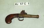 Lauf aus Messing, einem Kanonenrohr nachgebildet, mit hölzernem Griff vernietet und verschraubt. Zweiteiliges Schloss aus Stahl (Steinschloss).