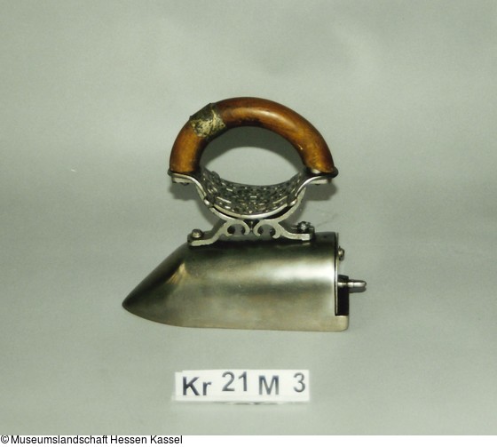 Gußeisen, vernickelt; Holz; messingfarbenes Blech |