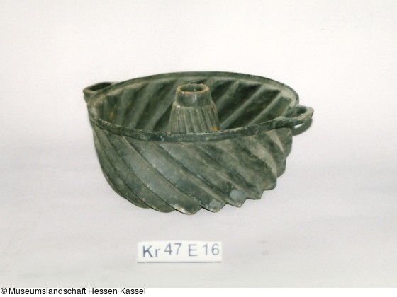 Runde Form. Wandung nach oben schalenförmig erweitert. Wandungs- und Zapfenverzierung in Form von aneinander gereihten schräg angeordneten dreiecksförmigen, geschwungenen Rippen, die ausgehend vom Zapfen sich zur Wandung hin verbreitern. Randabschluß der Wandung leicht wulstig. Offener Zapfen, der über den Rand der Form hinausgeht, oben mit breitem Randabschluß. Zwei gegenständige, waagrechte, unbewegliche Griffe mit oberem Rand abschließend.