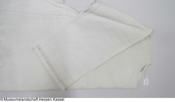 Weiß, halblange Ärmel, eingesetzte Achselkeile und Kanten; fadengerader, unten halbrunder, zuknöpfbarer Brustschlitz, Ärmelbänder mit Hohlsäumen.
