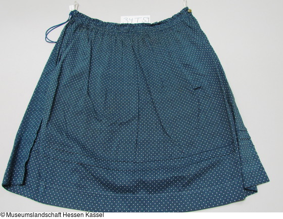 Blau-weiß gepunktet, eingezogener Bund mit breitem Band und blauer Kordel, einfache Saumschnur.