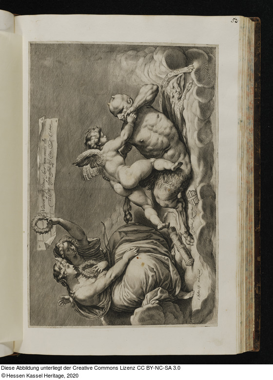 Hist. Inhaltsverzeichnis: 52 | Combat de Cupido & de Pan; au haut 2 vers: Natu- / ram quoq – ipse Deo | Jos. Arpinas inv. J. Matham sc.