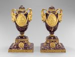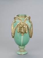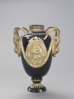 Hoher ovoider Vasenkörper auf kanneliertem Trichterfuß. Enghals mit umlaufendem Perlstab, Blattkranz und Mäanderband im Relief. Beidseitig der Wandung große, von Lorbeerkränzen gerahmte Medaillons mit auf Satyrn sitzendem Liebespaar. Dazwischen große Steinbockköpfe als Handhaben. Reliefdekor kalt vergoldet.