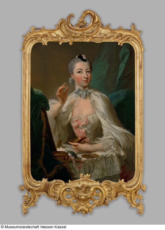Kniestück,sitzend nach links hinter einem Toilettetisch. Linker Unterarm aufliegend, in der Hand eine geöffnete Dose mit Schönheitspflästerchen, wovon eines eben Verwendung finden soll. Weißes Kleid mit rosa Schleifenbesatz u. weißer Frisiermantel mit blauem Besatz. Im Hintergrund lichtgrüne Draperie.