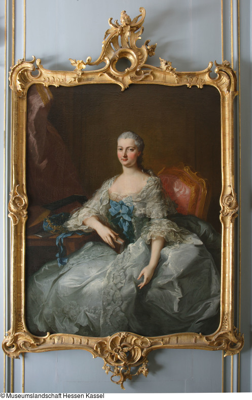 Friederike Charlotte (1698 - 1777), Gegenstück zur Landgräfin Marie. Kniestück, nach links auf Polsterstuhl rechts neben einem Tische sitzend. Rechter Ellenbogen aufgestützt, in der Hand ein Buch haltend. Helles blau-graues Kleid, brillant gemalte Moiréseide u. kobaltblauer Schleifenbesatz. Oberkleid durch Rüschenbesatz markiert. Weiß der Schulterkragen von leichten durchsichtigen Spitzen vor weinrotem Polster u. violetter Draperie. Auf dem Tisch Laute. Rundliches Antlitz mit blauen Augen. Auf der Rückseite landgräfliches Siegel.