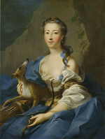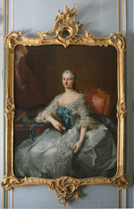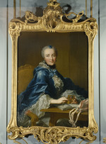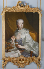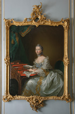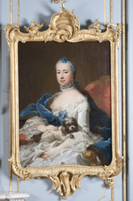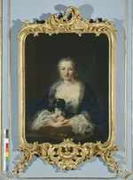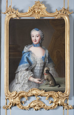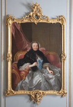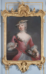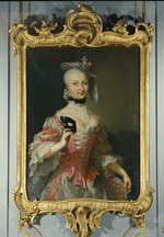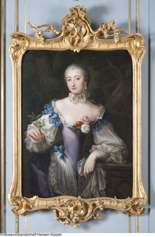 Dreiviertelporträt der Prinzessin Elisabeth Sophie, Gemahlin des Herzogs Carl von Württemberg und Tochter des Markgrafen Friedrich von Brandenburg-Bayreuth. Stehend neben einem Tisch. Linker Ellenbogen aufgestützt, in der rechten Hand blühenden Orangenzweig haltend. Blauviolettes Kleid, Reifrock mit spitzenbesetzter weißer Schürze und glatter Schnürtaille. Im Hintergrund Ausblick in Parklandschaft. Die linke Hand, die jetzt einen Zipfel der Schürze hält, hatte ursprünglich das Ende einer Blumengirlande gefasst, die später übermalt wurde.