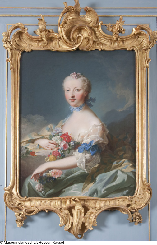 Ernestine von der Malsburg (1739-1812), Gemahlin des Generals Johann Wilhelm von Gohr auf Glimerode (1731-1817) im Dreiviertelportät nach links. In lockerem durchsichtigen Gewand, das über die linke Schulter heruntersinkt. Darüber ein hellblau und gelb gestreiftes Tuch, weit nach hinten ausbreitetend. Blaue Halsrüsche. Rosa Levkoje im Haar und Blütengirlande aus Levkojen, Rosen, Malven und anderen Gartenblumen in sehr lockerer Malerei zwischen den Händen. Am linken Arm blaues Band. Ausblick auf bewegten Himmel mit blauem Grundton.