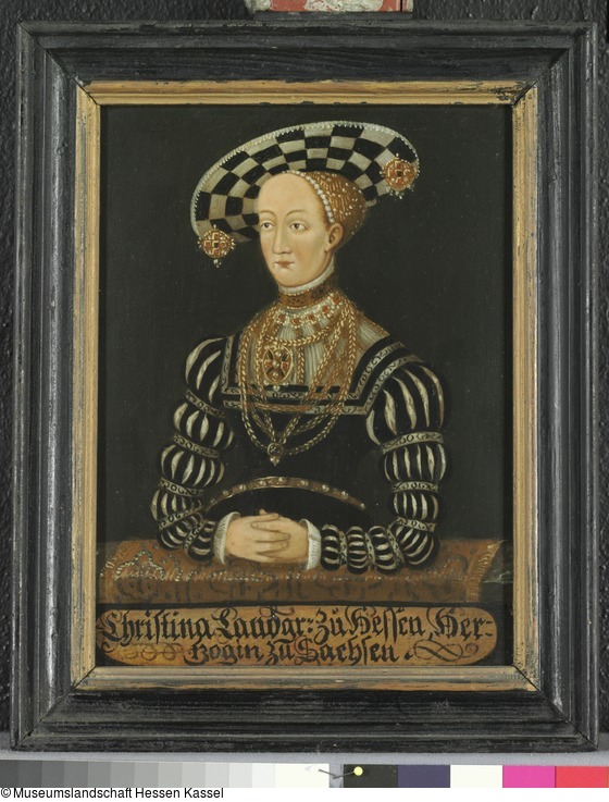 Halbfigur der Landgräfin Christina in Dreiviertelansicht nach links gewendet, vor einer Brüstung, die mit einem Teppich belegt ist. Dunkler Hintergrund. Der Mode entsprechend nach einer 1520 - 1535 gemalten Vorlage. Mit der durchgängig in den heraldischen Farben Grün-Weiß(Silber)-Gold gestalteten Kleidung, wird deutlich ihre Herkunft als sächsische Prinzessin herausgestellt. Das Kleid von grünem Samt von goldenen Borten besetzt, mit kastenförmigem Ausschnitt. Die Ärmel ''zerhauen'' (geschlitzt) und mit sechs goldenen Borten gebunden. Darunter ein weißer Futterstoff. Das feine Hemd in feinstem Plissé mit aufgelegten, aus Goldfäden geflochtenen Zöpfen. Der Kragen reich in Gold gestickt. Das Haar liegt unter einer mit Perlen geschmückten Golddrahthaube verborgen. Auf dem Haupt trägt sie einen runden Hut dessen Muster grüne und silberne Felder in schachbretthafter Verteilung zeigt. Daran links und rechts hängend zwei Kleinode mit je fünf riesigen Steinen. Um den Hals ein Perlencollier mit roten Steinen, drei schwere Gliederketten sowie das Hauptkleinod mit drei großen Perlen und vier roten und grünen Steinen. Um den Leib trägt sie nochmals einen Gürtel von Gold mit großen Perlen besetzt. Der Blick der Fürstin ist auf ihren Mann gerichtet, die Hände sind zu ''Treuen'' geschlossen. An der Brüstung eine zweizeilige Inschriftenkartusche: ''Christina Landgr: Zu Hessen Hertzogin zu Sachsen.''
