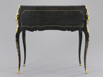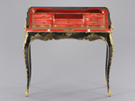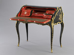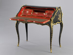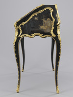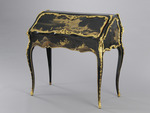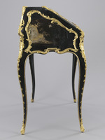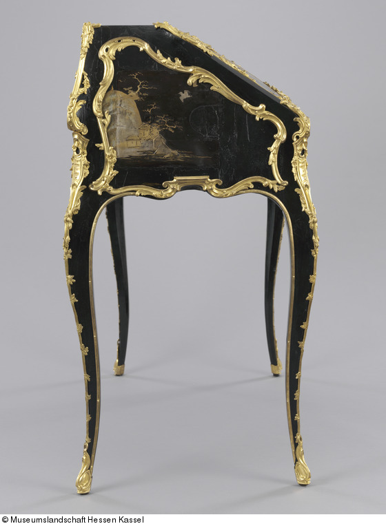 Schreibtisch in Eselsrückenform (en dos d'áne secrétaire en pente) auf geschwungenenen schlanken Beinen. Geschweifte Zarge, darüber aufklappbare Schreibplatte. Eichen- und Tannenkorpus z.T. furniert und mit französischem und japanischem Lack versehen. Malerei und Relieflack in Gold auf schwarzem Grund versehen. Auf der Schreibplatte außen japanischer Lack mit europäischen Ergänzungen und Überarbeitungen: Darstellung eines Wohnhauses mit Gartenlandschaft. Im Garten und auf der Terasse gruppieren sich jeweils drei Figuren, von denen einige eine Szene im Vordergrund beobachten: einen sitzenden Mann, der einen Affen dressiert. Die Darstellung durch einen Baum zentriert. Der japanische Lack ist bei Gewandmustern und Details sehr fein gezeichnet, hat jedoch durch Überlackierungen gelitten. Die Deckplatte, Zarge und die Seitenteile sind aus asiatischen und französischen Lackarbeiten zusammengesetzt: Landschaftsdarstellungen und Vögel. Die Platte durch feuervergoldete Beschläge mit Rocaillen und Blütenranken gerahmt; die Seiten und Kanten der Beine mit Blattranken. Im Innern geschweifte Schubladen und Fächer, dreireihig angeordnet, zwei Schubladen links als Geheimfach zusammengefaßt. Rechts drei kupferne, ''versilberte'' Schubladeneinsätze für Schreibutensilien. In der Mitte verschiebbare Platte, unter welcher ein schwarz lackiertes Fach liegt, das mit einfachen Ornamenten nachträglich bemalt wurde. Die Schreibplatte innen mit grünem Leder neu bezogen.