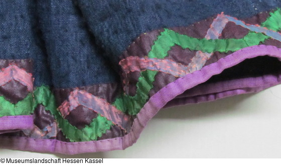 blauer Rock, am Saum breiter Bortenbesatz (violett, rosa, grün).