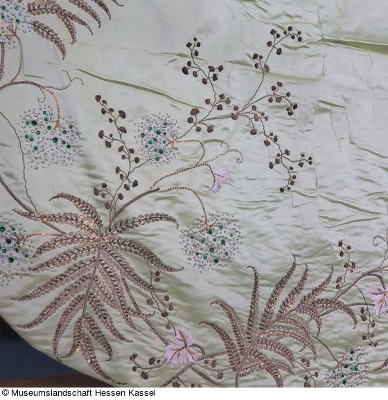 An der linken Längskante der Schleppe sind drei breite, cremefarbene Atlasbänder angenäht, die Spuren von drei Nahtstellen (resedagrüner Faden) aufweisen. Auf der Unterseite der Schleppe sind auf der rechten Längsseite und an jeweils zwei Stellen dazwischen ebenfalls Nahtspuren vorhanden. Möglicherweise wurde die Schleppe damit etwas zusammengerafft bzw. konnte mit diesen Querbändern aufgenommen und über den linken Arm gelegt werden.